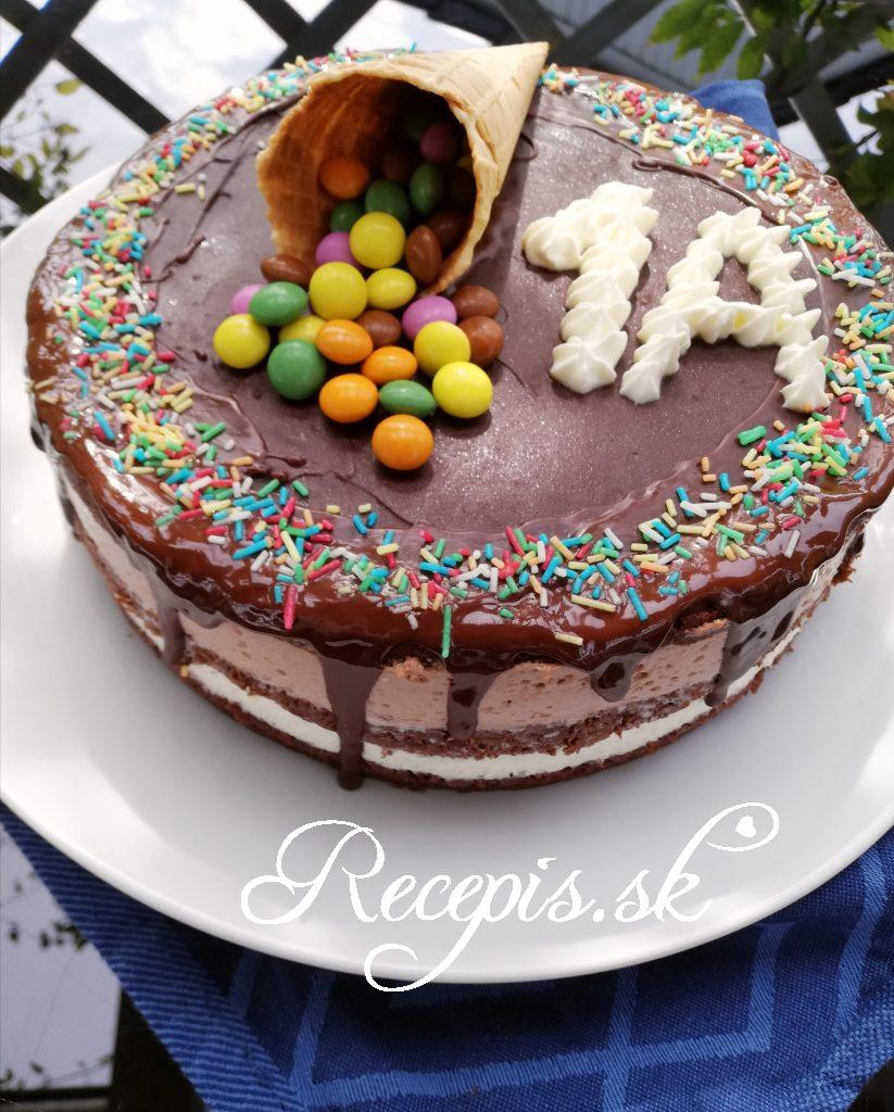 - Na záver si vyrobíme polevu. Na to zohrejeme šľahačkovú smotanu (nesmie zovrieť len sa nahriať), pridáme na malé kúsky pokrájanú čokoládu a dobre premiešame, až pokiaľ vznikne hladká tekutá poleva. Tú pomocou lyžičky nanesieme na vrchné cesto a rozotrieme.