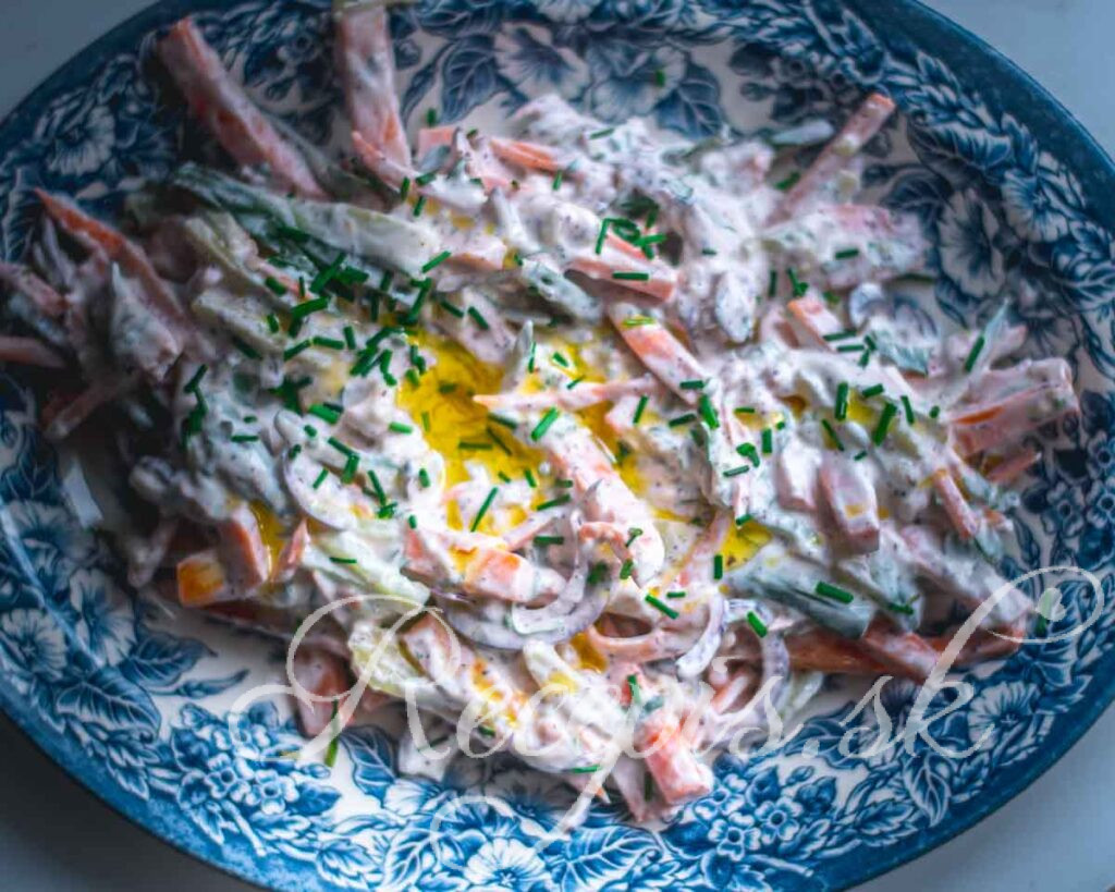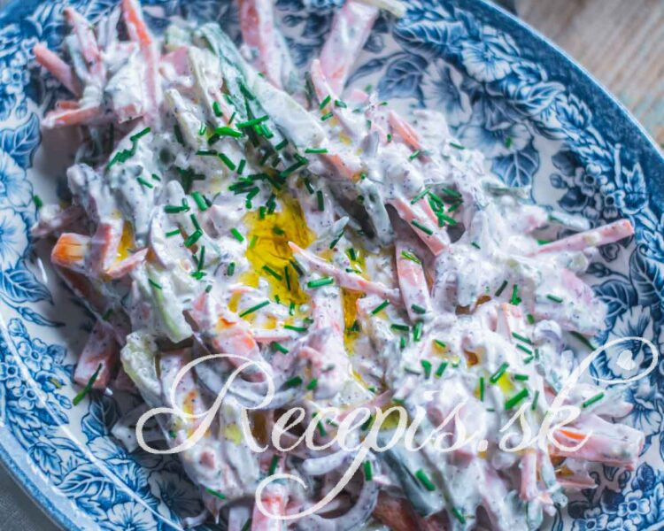 Chutný šalát k pečenému mäsu alebo dokonca aj ako hlavný pokrm. Optimálne je mať na strúhanie krájač, ktorý dokáže pokrájať zeleninu na tenké rezance, alternatívne proste postrúhať na hrubo.