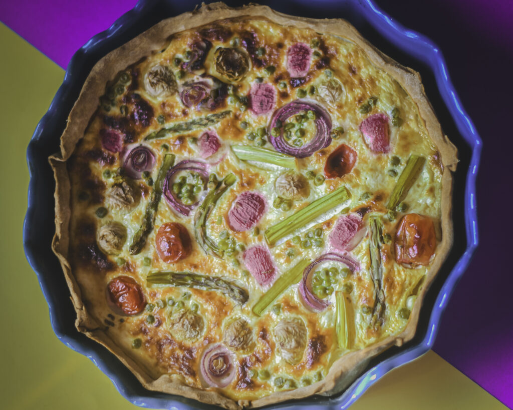 Quiche sú slané koláče pôvodom z Franzúzska, do ktorých sa dá spracovať akáakoľvek zelenina. Ja som sa rozhodla tentoraz pre kombináciu jarnej zeleninnky – zelenej špargle, cibuľky, reďkoviek, hrášku a rajčín. Vy však môžete siahnúť aj k iným druhom a vytvoriť tak krásne umelecké diela.